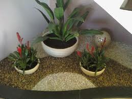 Aqui temos um vaso com um pacová (Philodendron martianum) e vasos mais baixos com a bromélia vermelha(Guzmania monostachya), pedriscos branco para decoração do vaso.Aqui a planta como destaque é uma palmeira Licuala, espécie que tem crescimento lento, assim pode ser mantida no mesmo vaso por muito tempo, não esquecendo que suas folhas são grandes e ocupam muito espaço.
