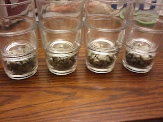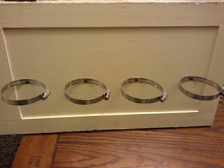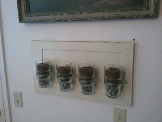 Uma portinha velha, oito copos de vidro, quatro braçadeiras, pedriscos, terra e mudas pequenas. quatro dos copos foram furados, com muito cuidado, para não quebrar o vidro. Aconselho levá-los ao vidraceiro para fazer esses pequenos furos, ele tem a máquina certa para isso. Mas, como outra solução podemos usar apenas quatro copos, com pedriscos e sem furo, optando por mini-cactos, que não necessitam de tanta água.