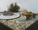 O esquema é o mesmo, o latão maior, está com pedras e com a bomba escondida no fundo, a mangueira sai da bomba e passa por dentro do latão menor onde se fez o furo, a mangueira chega na esfera azul. Você pode optar em não usar essa esfera e deixar somente as pedras.